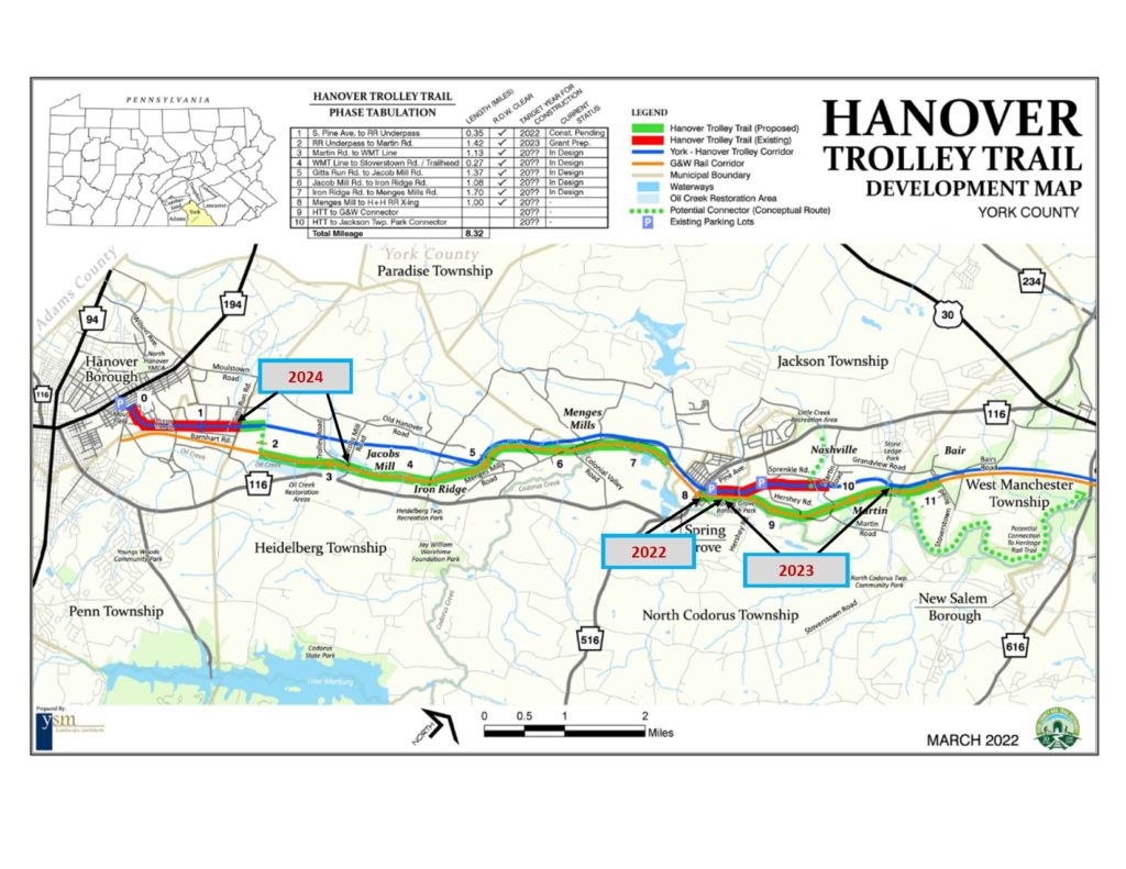 Map (below) outlines the Rail Trail Authority’s development plan to extend the Hanover Trolley Trail along an 8.5-mile rail corridor(bold green line) purchased in 2020. 2022 Phase was completed and opened to the public in May 2022. 2023 Phase is now under construction with a projected completion date of January 2024. Funding is currently being sought for 2024 Phase. Additional sections will be converted from rail corridor to trail as funding becomes available. Information available by contacting the Rail Trail Authority at info@yorkcountytrails.org or (717) 428-0999.